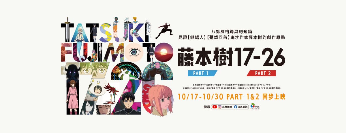 由 8 部短篇故事集結而成的《藤本樹17-26》,是《鏈鋸人》的作者「藤本樹」於 17 到 26 歲之間所創作的短篇集,且拆分為 Part1 和 Part2,期間限定兩週登上大銀幕。